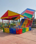 Cama Elástica 2 en 1 con Resbaladera. Estructura Elaborada en tubo negro de ¾” y 1¼” x 2mm de espesor, Pintada en esmalte al horno color aluminio. Desarmable, con protector de resortes y parantes preparado en lona plastificada en colores (rojo, verde, amarillo y azul) y acolchados con espuma de alta intensidad, con la mejor calidad y durabilidad para la diversión de nuestros clientes