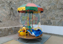 Fabricado en tubo negro de diferentes medidas (1¼”, 1”, ¾”)x 2mm , pintado con esmalte al horno color aluminio, el piso está elaborado en madera huairuro, terminado con laca brillante a la piroxilina, así mismo cuenta con 4 animalitos diferentes, confeccionados en fibra de vidrio pintados con hielco de diferentes colores y laqueados con esmalte transparente al horno, la sombrilla está diseñada en tubo negro de 3/4”x2mm pintado con esmalte al horno y forrado con lona plastificada en 4 colores a elegir.