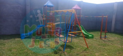 Confeccionado en madera huairuro, con parantes de 3”x 3”de grosor y pisos de circuito acabados en una pulgada de grosor ,por consideración de su uso al público, siendo material duradero y resistente, totalmente laqueado y barnizado en marino transparente, cuenta con accesorios metálicos fabricados en tubo negro estructural de diferentes medidas (2”,1”,1¼”,1¾”) y varillas lisa de ¾”, pintados con anticorrosivo y esmalte al horno de diferentes colores, desarmable y ensamblados con pernos zincados, techos y toboganes en fibra de vidrio, pintados con hielco de diferentes colores y laqueados al horno transparente, plataformas ancladas a 0.40m de profundidad en base de cemento protegido con brea.