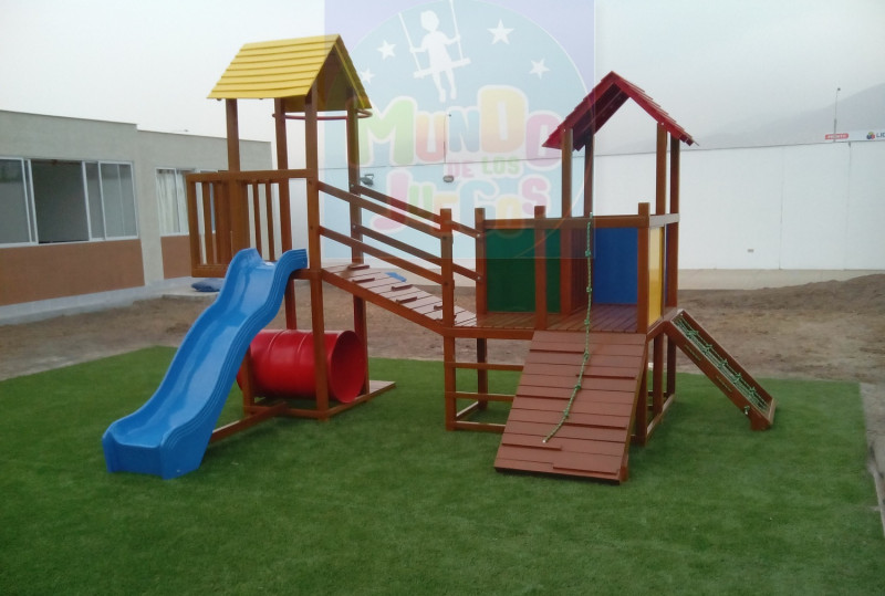 Elaborado en Madera huairuro con parantes de 4” x 4”, pisos en madera huairuro acabado en 1¼”de grosor, por consideración al uso público, debe ser duradero y resistente, totalmente laqueado y barnizado en marino transparente, cuenta con accesorios metálicos fabricados en tubo negro estructural de diferentes medidas (2”, 1½”, 1¼”, 1”, ¾” x 2mm. De espesor), y varilla lisa redonda de ⅜”, pintados con anticorrosivo y esmalte al horno de diferentes colores, desarmable y ensamblados con pernos zincados, toboganes en fibra de vidrio, pintados con hielco de diferentes colores y laqueados al horno transparente, plataformas ancladas a 0.40m de profundidad en base de cemento protegido con brea.
