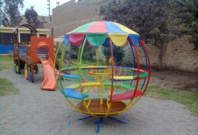 Fabricado en tubo negro estructural de (¾”,1”) x 2mm, pintado con esmalte al horno de diferentes colores, Asientos y piso elaborado en madera huairuro de 1¼” y barnizado, espaldar de tubo cuadrado y techo diseñado  en lona plastificada de diferentes colores. El juego comprende de un sistema giratorio de impulso manual y ejes de 6.5cm de diámetro, con dos rodajes plano y cónico, este juego tiene una capacidad para 10 a 12 niños
