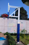 Estructura en tubo negro cuadrado de 5”x 4mm, pintado en color blanco, anclado al piso con concreto. Tablero de básquet rectangular en vidrio templado de 1.80 x 1.05Mt, 10mm de espesor, medidas oficiales FIBA, montado en un arco de aluminio, el aro de básquet fabricado en alta resistencia con net de Nylon, el parante cuenta con relleno de protector frontal de 2” de espesor de espuma resistente, cubierto con lona plastificada resistente a la rotura de color azul o a elegir y sistema regulable de 3.05mx 2.60; siempre con la mejor calidad para todos nuestros clientes.