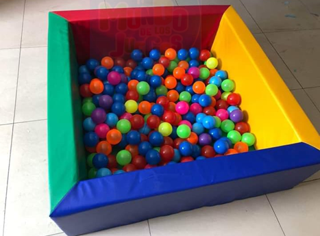 Diseñado en espuma lila Zebra Paraiso 400 de alta densidad, forrados con lino pesado, plastificado, lavable y No Toxico, colores y tonos variados entre los que comprende el azul, verde, amarillo, rojo, naranja y está llena con 300 pelotas plásticas.