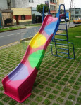 Resbaladera Diseñada en fibra de vidrio de 4mm de espesor, pintada con resina hielco de colores y Escalera fabricada en tubo cuadrado de 7/8, con escalones de madera huairuro