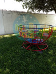 Fabricado en tubo negro estructural de (¾”,1”) x 2mm, pintado con esmalte al horno de diferentes colores, Asientos y pisos elaborados en metal, comprende de un sistema giratorio de impulso manual y ejes de 6.5cm de diámetro ,con dos rodajes plano y cónico este juego tiene una capacidad para 10 a 12 niños